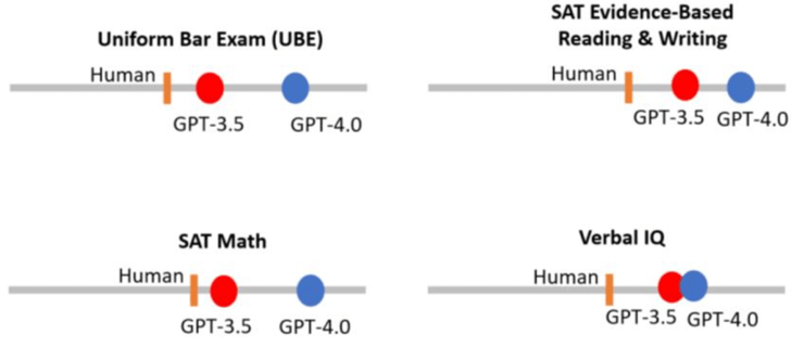 Recent advances in AI’s capabilities are impressive, with many computers able to score higher than most humans in many different tests (Hamilton et al., 2023). These advancements are already demonstrating the superior power of computers over humans in many sectors, including education, and mimicking the success of AlphaGo. For example, according to the findings of Bruno Campello de Souza and Antonio Roazzi, GPT-4—the most recent version of ChatGPT—surpasses 90% of individuals on both the Uniform Bar Exam and the SAT, achieves better than 88% of people on the LSAT, and possesses a verbal IQ that places it in the top 0.02% of the human population.