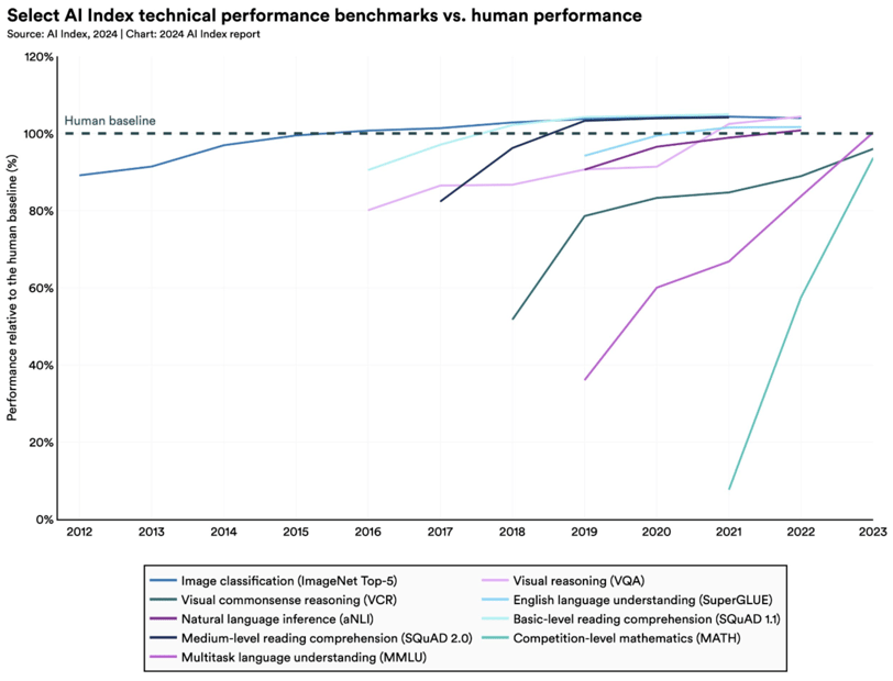 Figure 3: Select AI Index Technical Performance Benchmarks vs. Human Performance( Perrault et al., 2024).