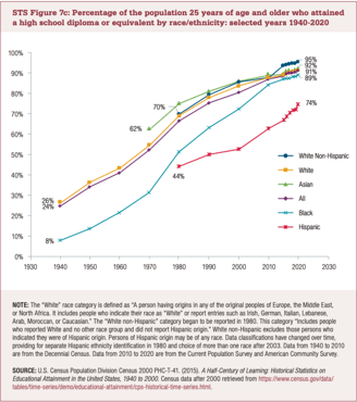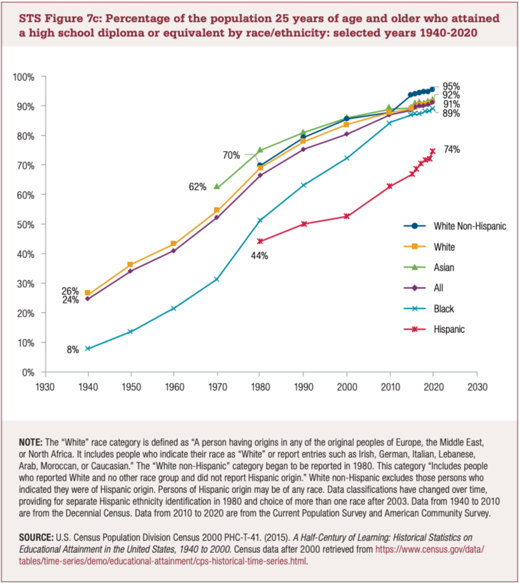 Figure 5: Percentage of Population 25 Years or Older who Attained A Highschool Diploma or Equivalent by Race/Ethnicity: Selected Year 1940-2020 (Kochmar et al., 2022).